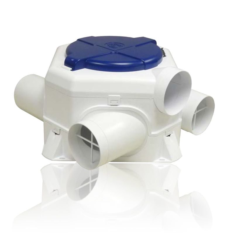 Вентилятор состоит из пластикового корпуса с четырьмя всасывающими патрубками и одним нагнетательным, все патрубки имеют диаметр 125 мм. В комплекте с вентилятором поставляются три заглушки, которыми можно закрыть всасывающие патрубки, если нет необходимости использовать все четыре вытяжных канала.