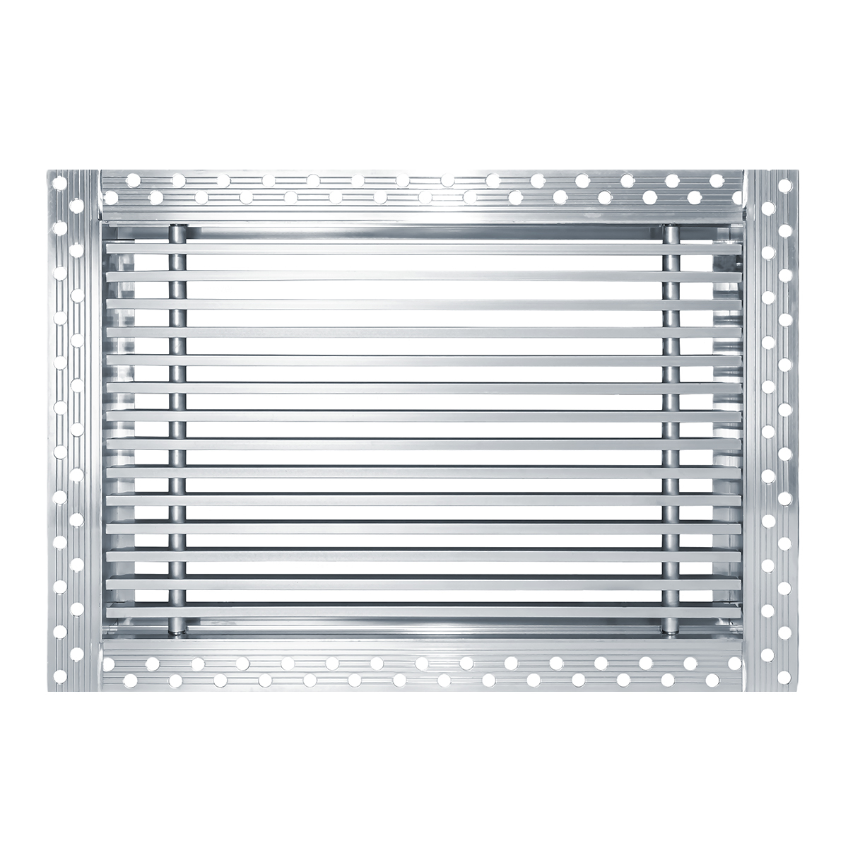Данная решетка подходит для монтажа на любую поверхность под финишную отделку. Рамка и экран изготовлены из алюминия, опора экрана - из оцинкованной стали. Рама оснащена «полкой» 1,9 мм и рифлеными краями для большей адгезии финишного материала – шпатлевки, цемента. Решетка имеет съемную центральную часть с фиксированным углом наклона ламелей 0°. Она крепится к корпусу прочными металлическими тросиками, легко снимается для очистки и удобного обслуживания.