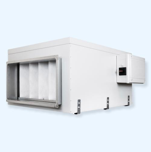 Приточная установка оснащена фильтром класса G4, электрическим нагревателем и вентилятором. Установка оборудована электронно-коммутируемым ЕС двигателем. Защита двигателя вентилятора осуществляется встроенными термоконтактами. Трехфазные электрические нагреватели оснащены двухступенчатой защитой от перегрева. Первая ступень настроена на +60°С и перезапускается автоматически, вторая ступень настроена на +110°С и перезапускается вручную.