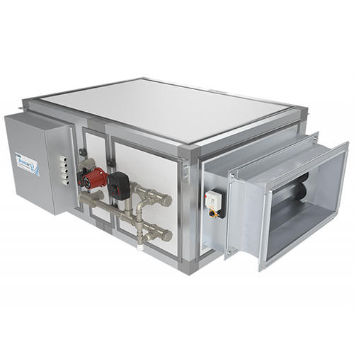 - Приточная установка с нагревателем водяного типа и смесительным узлом с 2-х или 3-х ходовым клапаном (узел подбирается исходя из типа водоснабжения).