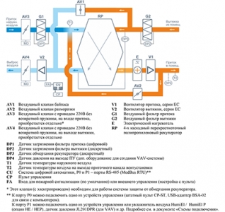 HEP – Управление увлажнителем с электрическим пред- и постнагревателем WEB – Удаленное управление вентустановкой через web-интерфейс CT – Поддержание температуры в помещении по доп. датчику температуры (каскадный регулятор) CC – Автоматическое переключение тепло/холод (датчик заказывается отдельно) DC – Выход "сухие контакты" для управления ККБ типа On/Off (несовместимо с PC) PC – Выход 0-10В для управления инверторным ККБ (несовместимо с DC)