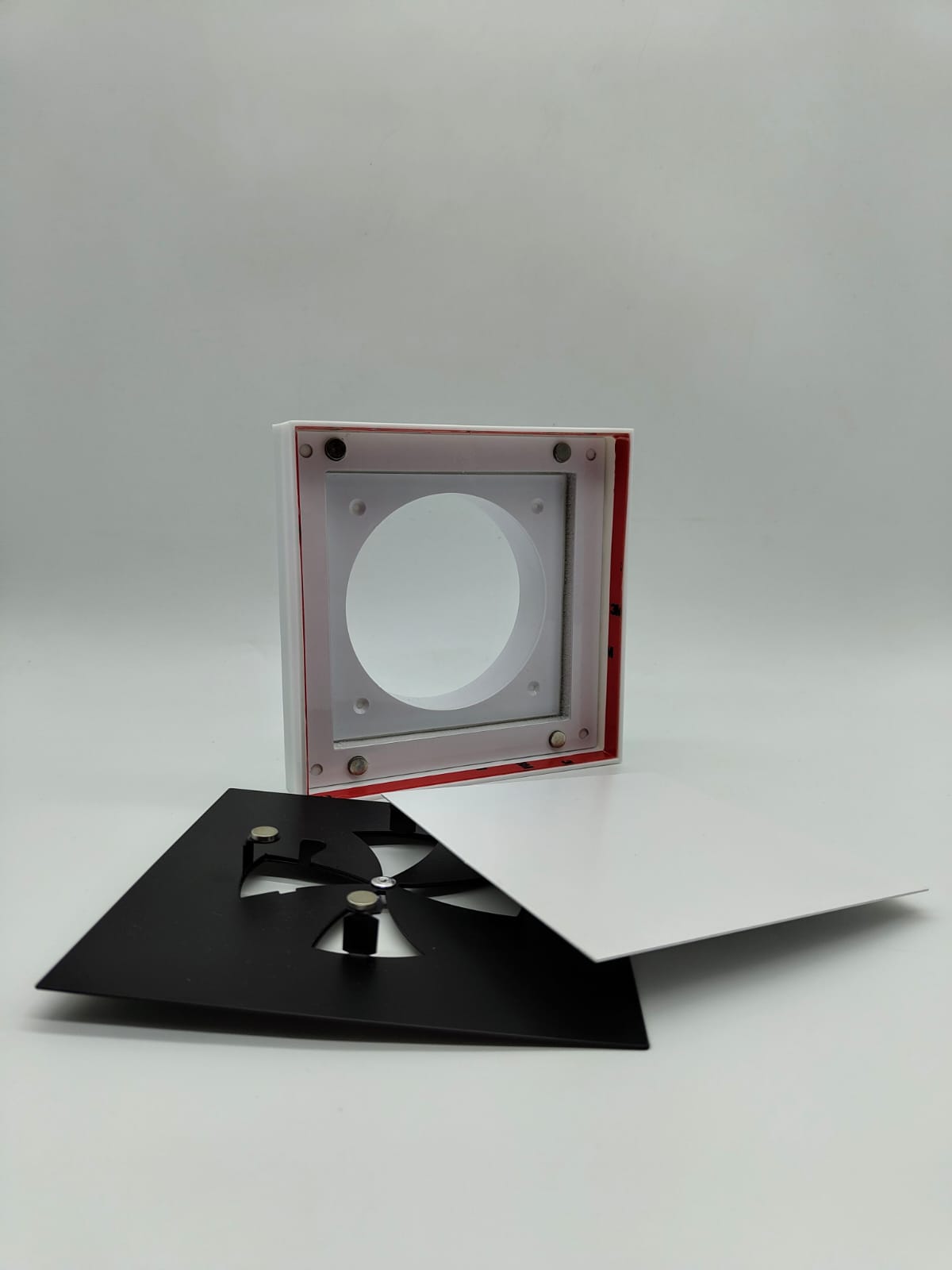 Диффузор состоит из пластикового перехода, металлической заслонкой, которой можно регулировать поток воздуха, либо полностью перекрыть его. К заслонке с помощью магнитов крепится декоративная квадратная панелька, которую можно покрасить в цвет потолка. Так же по ободку диффузора имеется надёжный двухсторонний скот марки 3М, к которому крепится полотно натяжного потолка.